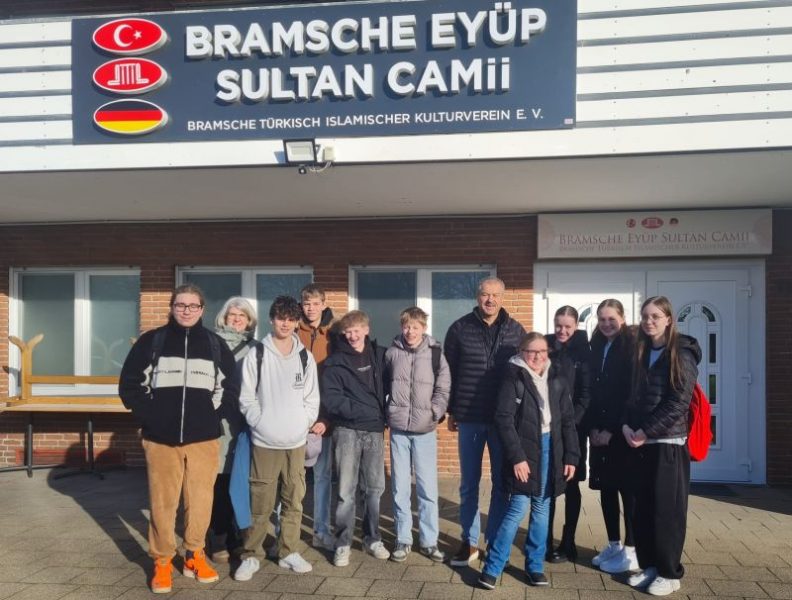 Unsere Religionskurse aus den Jahrgängen 7 und 8 haben die Eyüp-Sultan-Moschee in Bramsche besucht. Zum Abschluss der Unterrichtseinheit „Islam“ stellte Herr Irmak als Vorsitzender der islamischen Gemeinde den Schülerinnen und Schülern das Gebetshaus der Muslime vor. Anschließend saßen alle im Kreis auf dem Gebetsteppich des Gebetsraums und konnten Herrn Irmak Fragen stellen. Der Koran wurde herumgegeben, wobei er nicht den Boden berühren durfte und immer höher als der Bauchnabel gehalten werden musste. „Alle Schülerinnen und Schüler waren sehr respektvoll und interessiert“, freute sich Religionslehrerin Andrea Hugenberg, die die Gruppe an diesem Tag begleitet hatte.