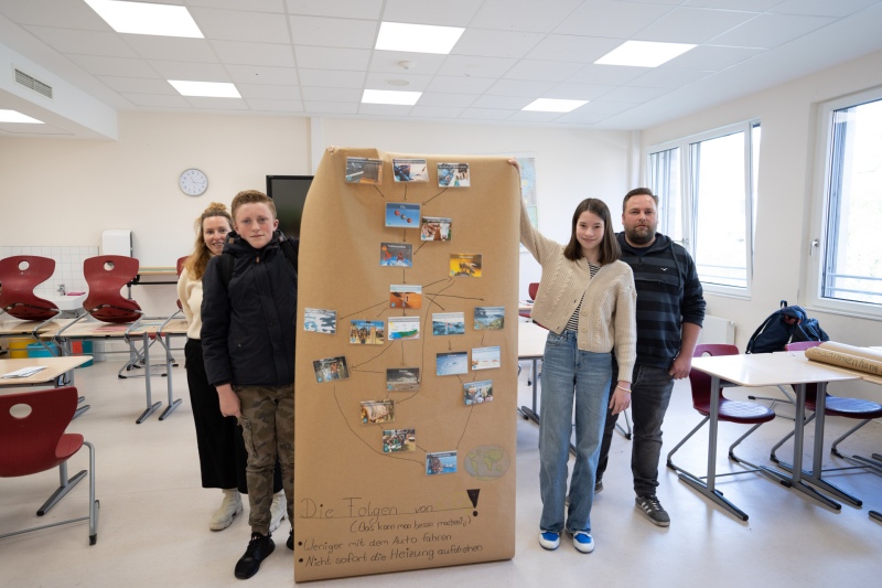 Beim Klimapuzzle handelt es sich um einen Workshop, bei dem alle Teilnehmenden die Aufgabe haben, nach und nach zahlreiche Informationskarten, die die verschiedenen Komponenten der Klimakrise veranschaulichen, auf dem Spielfeld zu platzieren und diese miteinander zu verbinden. Damit soll ein Bewusstsein dafür geweckt werden, unsere Umwelt im Blick zu haben. Den Schülerinnen und Schülern, die in mehreren Gruppen arbeiteten, wurde dabei verdeutlicht, dass der Klimawandel ein vom Menschen gemachtes Problem ist. Und es wurde überlegt, wie wir Menschen etwas dagegen tun können.