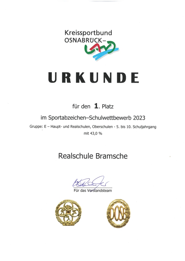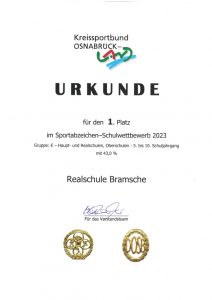 43 Prozent unserer Schülerinnen und Schüler haben im vergangenen Jahr das Sportabzeichen gemacht. Damit hat sich unsere Schule im Sportabzeichen-Schulwettbewerb des Kreissportbundes Osnabrück-Land in der Kategorie „Haupt- und Realschulen sowie Oberschulen“ durchgesetzt. Keine andere Schule in dieser Kategorie konnte im Gebiet des Kreissportbundes eine bessere Quote vorweisen. Insgesamt zeigten genau 144 unserer Schülerinnen und Schüler, dass sie in den vier Bereichen Ausdauer, Schnelligkeit, Kraft und Koordination fit sind.