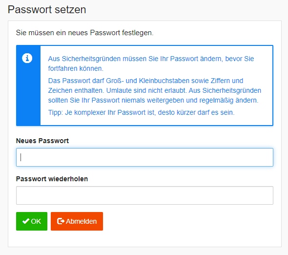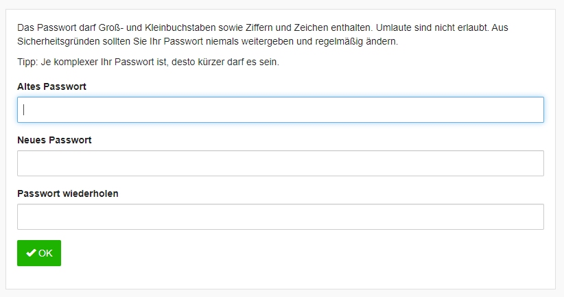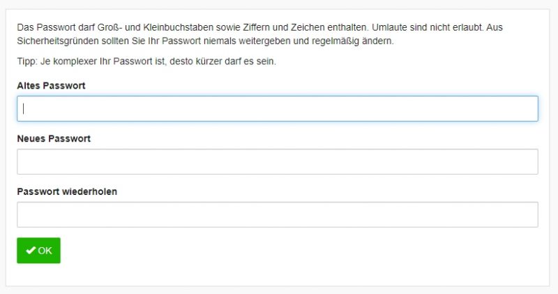 Nun gibst du unter Altes Passwort (das bisherige) und sowie unter Neues Passwort und Passwort wiederholen ein Passwort ein, was du dir ausgedacht hast und den Richtlinien (siehe Ich habe ein neues Passwort erhalten. Muss ich es ändern?) entspricht.