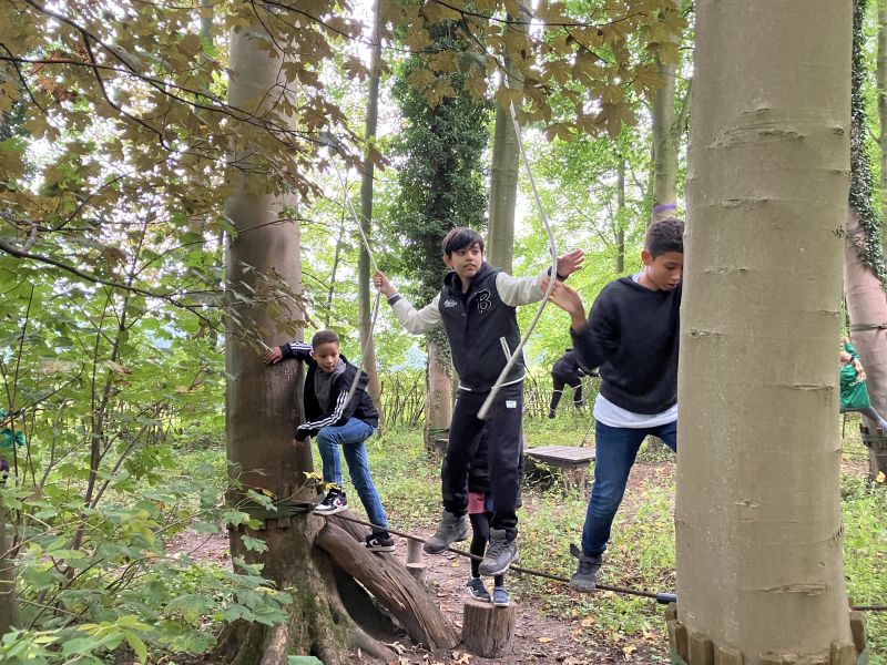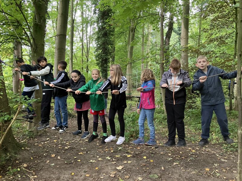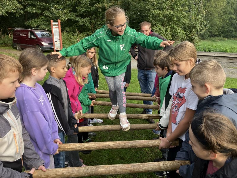 Unsere neuen Schülerinnen und Schüler aus den 5. Klassen haben kurz vor den Herbstferien noch einmal eine tolle Gemeinschaftsaktion erlebt. Beim Besuch des Niedrigseilgartens in Kalkriese konnten sie ihre Geschicklichkeit und Kraft an Seilen und Netzen, aber auch beim Hangeln und Schwingen an Tauen erproben. Ziel war es, spielerisch Vertrauen zueinander zu gewinnen und gleichzeitig zu lernen, wie wichtig gute Zusammenarbeit ist. Denn den Niedrigseilpfad konnte niemand alleine bewältigen. Ihr Ziel erreichten die Gruppen nur gemeinsam: durch Hilfestellung, Absprachen und Ideen.