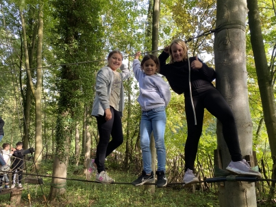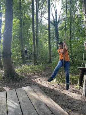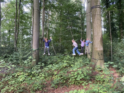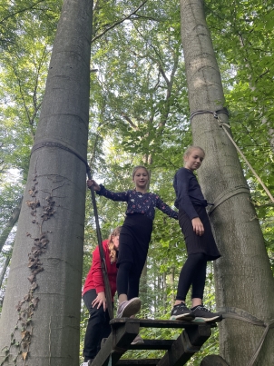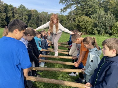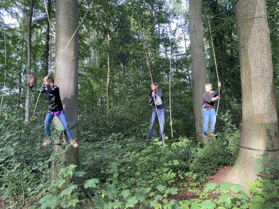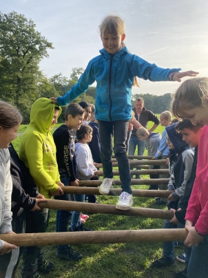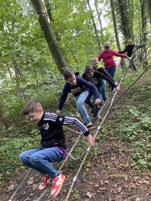 Unsere neuen Schülerinnen und Schüler aus den 5. Klassen haben kurz vor den Herbstferien noch einmal eine tolle Gemeinschaftsaktion erlebt. Beim Besuch des Niedrigseilgartens in Kalkriese konnten die jeweiligen Teammitglieder die eigene Geschicklichkeit und Kraft an Seilen und Netzen, aber auch beim Hangeln und Schwingen an Tauen erproben. Ziel war es, spielerisch Vertrauen zueinander zu gewinnen und gleichzeitig zu lernen, wie wichtig gute Zusammenarbeit ist. Denn den Niedrigseilpfad konnte niemand alleine bewältigen. Ihr Ziel erreichten die Gruppen nur gemeinsam: durch Hilfestellung, Absprachen und Ideen.