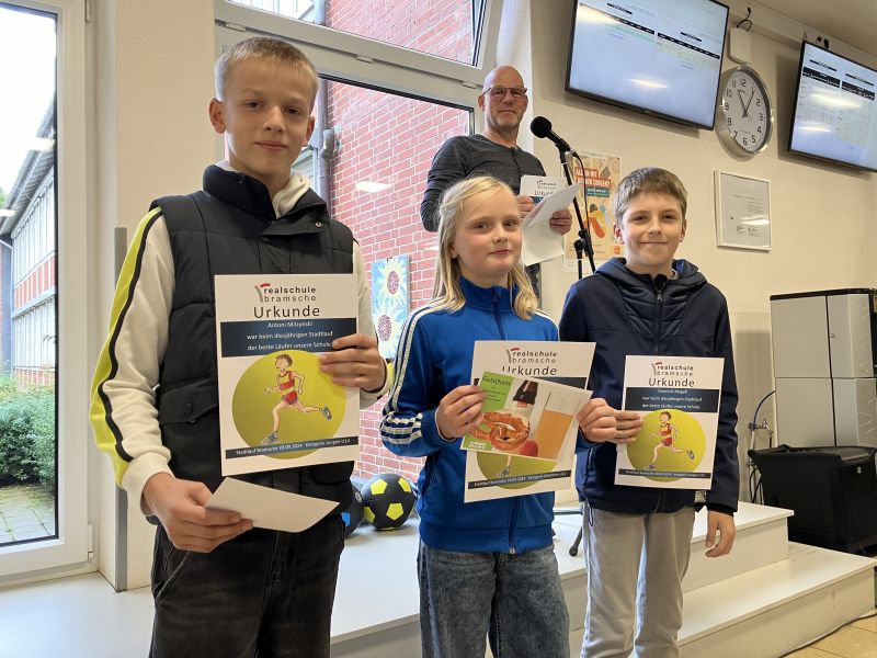 Auf einer Schülervollversammlung in der Aula wurden in der vergangenen Woche mehrere Schülerinnen und Schüler und auch einige Klassen für besondere Leistungen ausgezeichnet. Schulleiter Martin Köchert ehrte zunächst die erfolgreichsten Teilnehmerinnen und Teilnehmer des Stadtlaufs. Dies waren Antoni Milzynski, Dominik Magell und Leni Schedel.