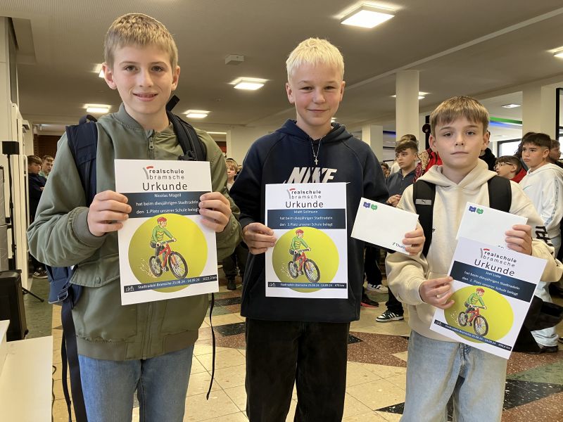 Auch beim Stadtradeln gab es einige hervorragende Ergebnisse. Die größten Strecken mit dem Fahrrad legten Nicolas Magell (1022 Kilometer), Joel Liske (490 Kilometer) und Matti Sollmann (478 Kilometer) zurück. Neben der Einzelwertung gab es auch die Klassenwertung. Hier sicherte sich die Klasse 6b (3455 Kilometer) den ersten Platz vor der 6a (3195 Kilometer) und der 5b (2524 Kilometer).