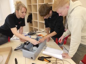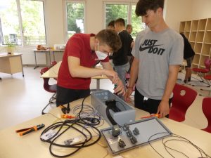 Ein weiteres Highlight wurde von der Firma EAB Elektrotechnik GmbH angeboten. In einem 4-stündigen Crashkurs wurde einer kleinen Gruppe von Schülern der Aufbau von Schaltkästen und das dazugehörige Verdrahten nahegebracht. Frau Lauxtermann und die Auszubildenden Julius Garten und Timo Telscher standen der Gruppe dabei mit Rat und Tat zur Seite. Beim Aufbauen der Schaltkästen war die konzentrierte Arbeit der Schüler zu beobachten. „Ich habe vorher noch nie einen Schaltkasten von innen gesehen und finde es total cool, dass wir heute selber mal einen Kasten zusammenbauen dürfen“, teile ein Teilnehmer auf Nachfrage mit.