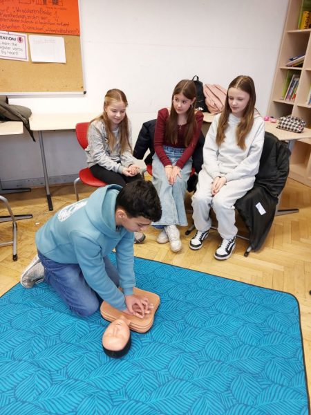 Wie reagiere ich, wenn jemand bewusstlos auf dem Boden liegt? Was ist die stabile Seitenlage? Und wie funktioniert die Herz-Lungen-Wiederbelebung? All dies erläuterten die Schulsanitäter in den vergangenen Wochen allen Klassen von Jahrgang 5 bis 10. Sie zeigten ihnen mit praktischen Übungen, worauf es im Notfall ankommt und beantworteten auch viele Fragen rund um das Thema Erste Hilfe, die insbesondere in den jüngeren Jahrgängen aufkamen.